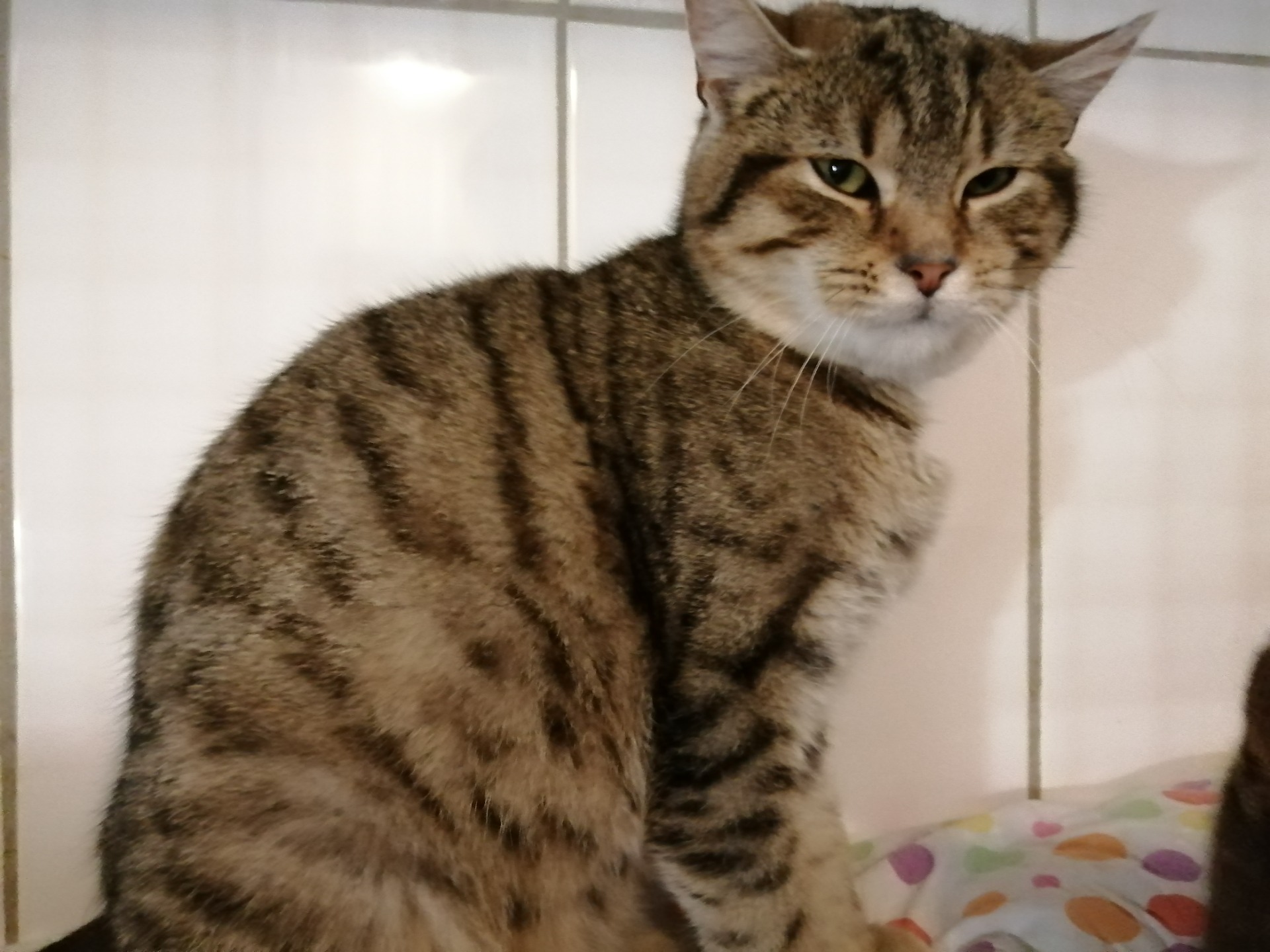 Kocourek žil od jara na nádraží v Blatnici pod sv.Antonínkem společně se stejně krásnou mourovatou kočičkou ale o něco mladší. Nehnuli se od sebe ani na krok.I u nás když byli v karanténě odděleni ,nejedli, byli smutní zřejmě se jim stýskalo. Když se ocitli opět spolu jsou v pořádku, spinkají vedle sebe a Bonzo na Beluši jak se kočička jmenuje drží ochrannou packu. Bonzo je velmi klidný, hodný, milý kocourek narozeny cca v roce 2024. Je již kastrovaný, FELV,FIV negativní, bude očkovaný.