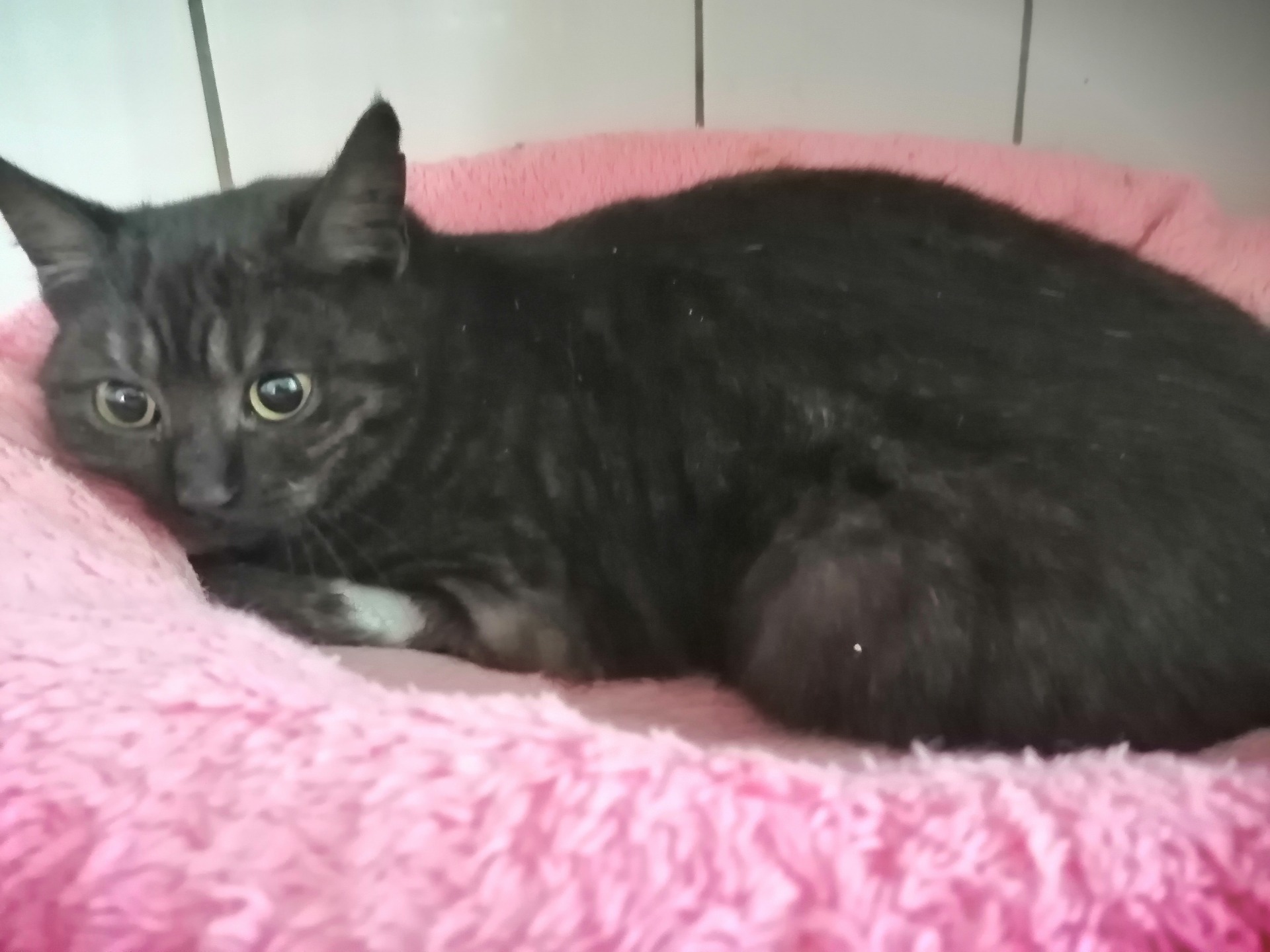 Chaluha byla nalezená v UH naproti kauflandu. Večer ji zde našel pán a poprosil o přijetí .Kočička byla zraněná, zadní nožičku tahala za sebou. Na klinice ji byl udělaný rtg, musela být přispaná, kvůli bolestivosti nožky byla agresivní. Měla mírně vychýlenou páteř . hůře chodila. Na zádíčkách má vylísané místo udělaly se boláky. Vyšetření kůže vzorky zaslány do laboratoře, plísně ani parazity nemá. Protože se stav nelepší, je objednána na biopsii kůže. Chaluha je narozená cca v roce 2023,je FELV,FIV negativní. Kastrovaná zatím není. Je moc hodná, přítulná, mazlivá. Její nález byl nahlášený na město UH ale doposud ji nikdo nepostrádal.